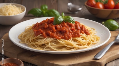 A plate of spaghetti with red sauce and basil on top. 3D illustration