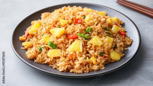A plate of Thai pineapple fried rice, brightly illuminated to showcase the vibrant colors, pineapple fried rice, studio lighting, vibrant