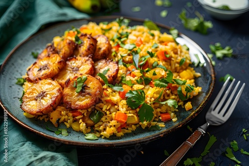 A plate of vibrant orange rice with golden brown fried plantains on the side, on an isolated dark background,