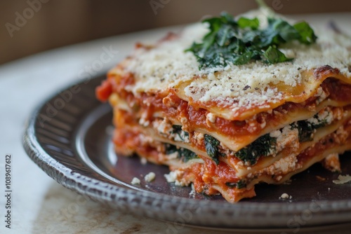 A plate of warm lasagna with fresh spinach and melted cheese, perfect for comfort food or Italian-inspired cuisine