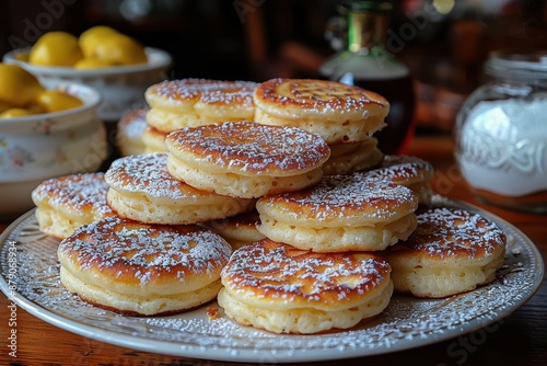 A plate of Welsh cakes, dusted with sugar and served warm.