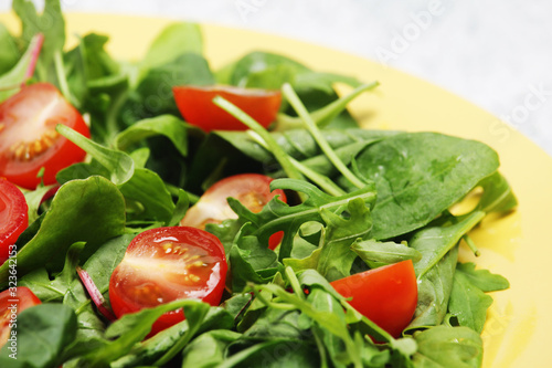 A plate with green salad and cherry tomatoes