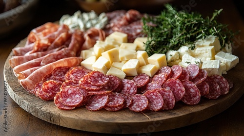 A platter of assorted cured meats and cheeses with fresh herbs, perfect for entertaining guests.