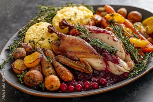 A platter of roasted pheasant served with a cranberry-orange reduction, accompanied by roasted root vegetables and a side of creamy polenta, garnished with fresh rosemary and thyme.