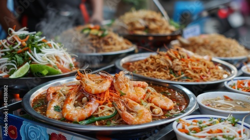 A platter of Thai street food delicacies including pad thai, green papaya salad, and bowls of steaming hot tom yum soup, a feast for the senses
