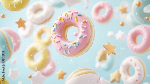 A playful array of colorful donuts floats against a soft blue background, adorned with sprinkles and star accents, creating a whimsical dessert scene.