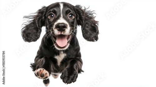 A playful black and white dog joyfully leaps forward, showcasing its lively spirit and enthusiasm.