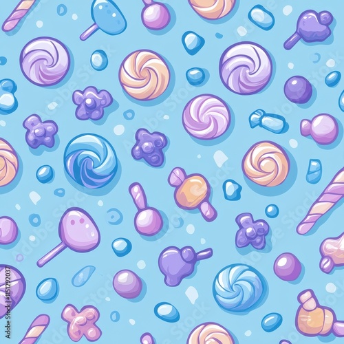 A playful candy-themed pattern with lollipops, gummy bears, and peppermint swirls in pastel tones like pink, lavender, and mint green.