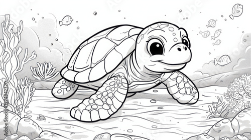 A playful cartoon piranha with big eyes and sharp teeth swimming against a vibrant ocean background, designed as a fun and engaging coloring page for kids, featuring waves, bubbles, and coral reefs..