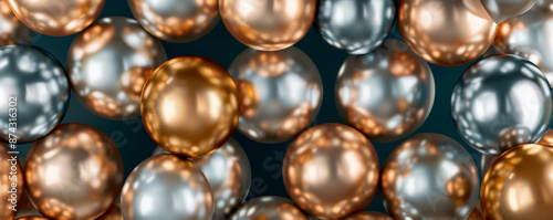 A playful display of metallic balloons in gold, silver, and rose gold, reflecting light and creating a luxurious and celebratory mood against a dark blue background.