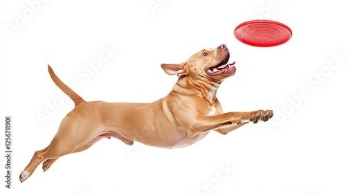 A playful dog leaps in the air to catch a red frisbee against a white background. The dog exudes joy and energy in this fun moment.