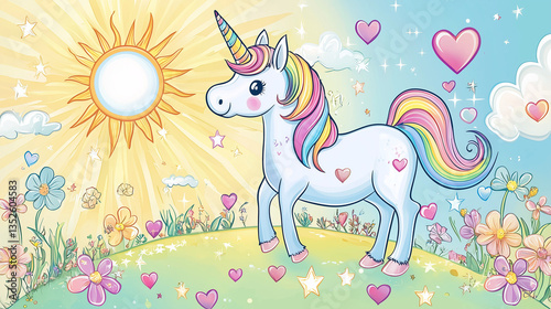 A playful drawing of a unicorn in a dream-like meadow, surrounded by hearts, stars, and colorful flowers.