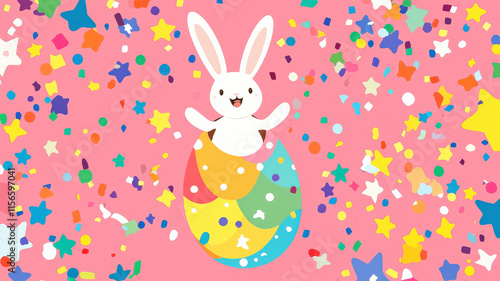 A playful Easter card featuring a bunny popping out of a colorful egg, surrounded by vibrant confetti and stars. The bottom area is blank, ideal for personal greetings and messages.