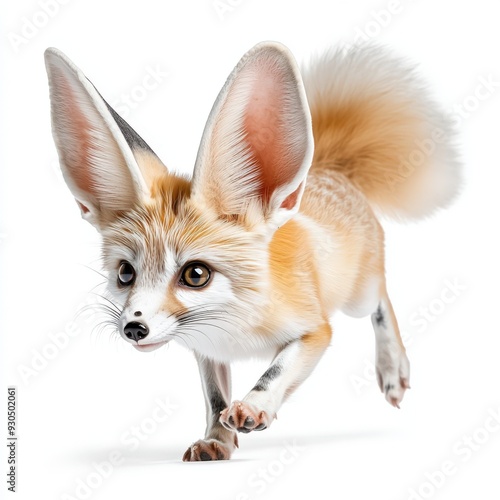 A playful fennec fox with large ears and a fluffy tail, running gracefully across a bright white background.