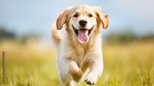 A playful golden retriever running through a field of grass, bright sunny day, tongue out, full of energy and happiness.
