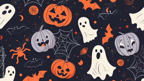 A playful Halloween pattern featuring pumpkins, ghosts, bats, and spiders with a dark background, invoking a spooky festive atmosphere.