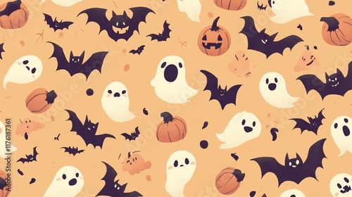 A playful Halloween-themed pattern featuring ghosts, bats, and pumpkins.