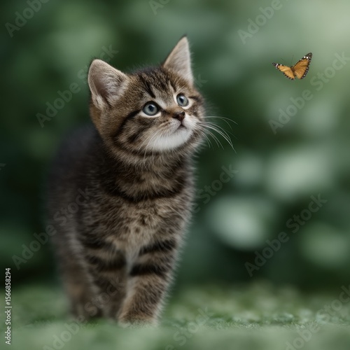 A playful kitten gazes at a fluttering butterfly in a serene garden setting