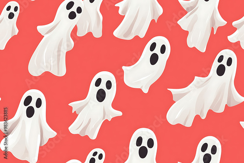A playful pattern of various cartoon ghosts with expressive faces on a background. The ghosts have wide eyes and open mouths, evoking surprise or fright. Ideal for Halloween designs