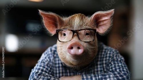 A playful pig with glasses sits at a table, dressed in a checkered shirt, in a contemporary cafe. The atmosphere is lively and showcases a blend of humor and charm
