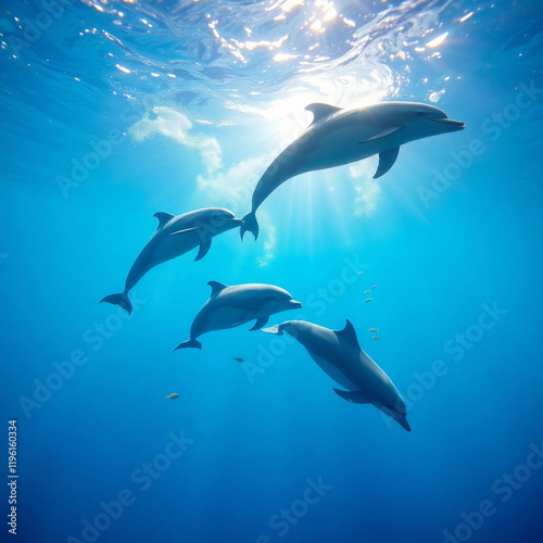 A playful pod of dolphins leaping and spinning through crystal-clear turquoise waters, with sunlight filtering through the waves and a school of colorful fish swimming nearby."
