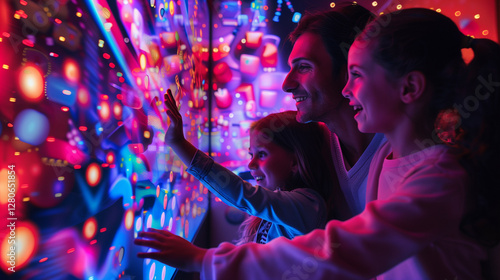 A playful scene of a family playing an interactive game on a large touchscreen, with colorful, game-like visuals bursting from the screen in bright, fun patterns.