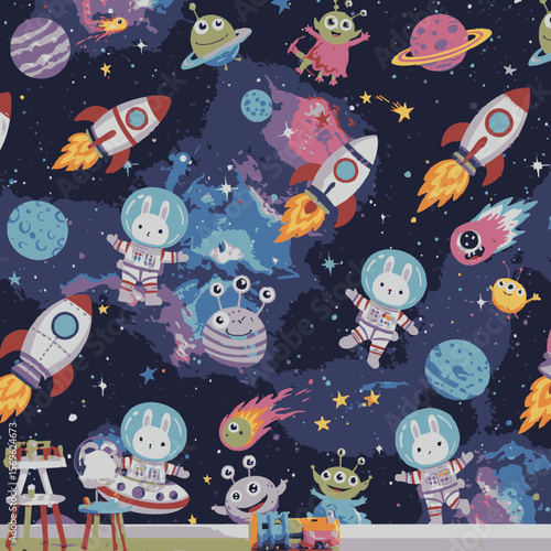 A playful seamless pattern featuring adorable astronaut bunnies, colorful rockets, and friendly aliens exploring a whimsical galaxy with planets and stars.