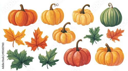 A playful set of cartoon-style pumpkins with green leaves, showcasing autumn's rich colors in a fun and festive design, great for Halloween or Thanksgiving.