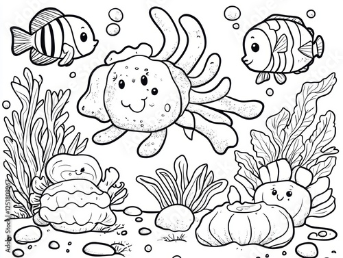 A playful underwater scene featuring cute sea creatures and plants.
