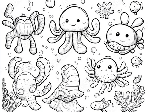 A playful underwater scene featuring cute sea creatures in a coloring page style.