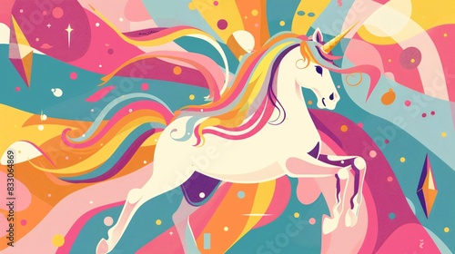 A playful, whimsical illustration of a unicorn with a rainbow mane prancing through abstract shapes and lines, ideal for a Pride Month commercial