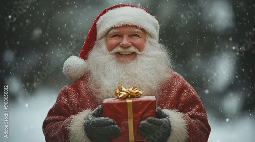 A pleasant and joyful smiling Santa Claus with gifts in his hands