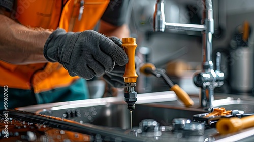 A Plumber Uses a Tool to Repair a Leaky Faucet in a Kitchen Sink