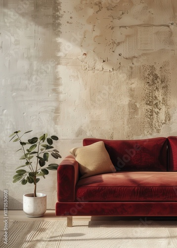 A plush burgundy velvet sofa sits against a warm brown wall. bathed in sunlight. with a potted plant casting shadows