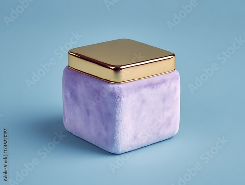 A plush purple jar with a golden lid sits on a light blue background, studio shot