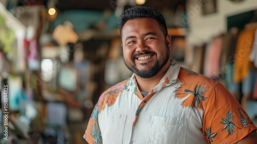 A plus-size man smiles confidently while wearing oversized clothing in a vibrant thrift shop filled with eclectic decor and bright natural light