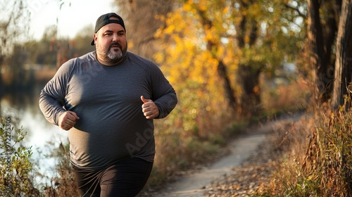 A plus-sized man jogging along a scenic trail, determination in his expression as he focuses on his fitness journey