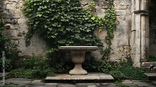 A podium in a rustic outdoor courtyard, with ivy growing along stone walls