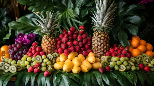 A podium wrapped in greenery, surrounded by fresh fruits like strawberries, kiwis, and pineapples, vibrant lighting