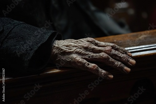 A poignant close-up scene showcasing a man's deformed hand, highlighting the contrast between the withered fingers and a healthy hand, enveloped in a somber atmosphere inside the synagogue.