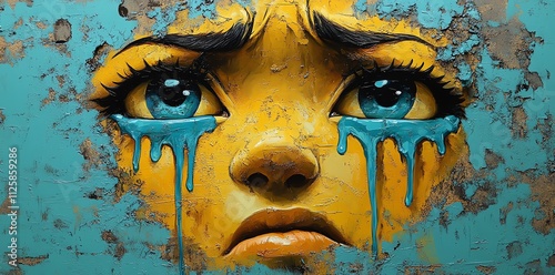 A poignant mural depicting a sad face with tears, highlighting emotional depth and vulnerability.