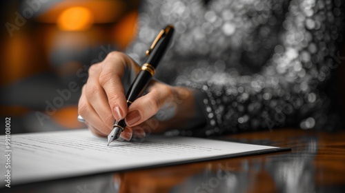 A poised hand elegantly signs a document under warm ambient light in a cozy office setting. Generative AI