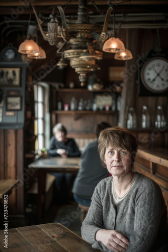 A poised woman gazes at the clock on the wooden wall, lost in thought as she sits at the table, her face adorned with a sense of tranquility, exuding a sense of elegance in her clothing
