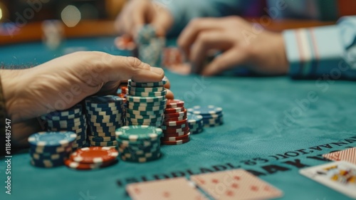 A poker player collects the bets on the table with both hands. Huge profit from playing poker. Gambling theme. Male hands with colorful playing chips close up. Gaming invitation
