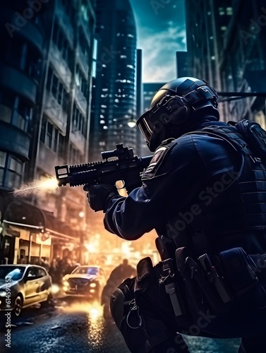A police officer shooting a target with a musket in the midst of a riotous city. Generative AI