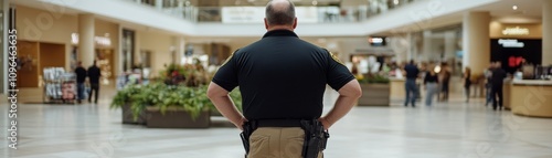 A police officer stands watch in a shopping mall, ensuring safety and security amidst the bustling crowd.