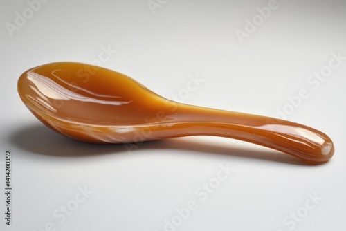 A polished amber-colored horn spoon, elegantly curved, rests on a white background.