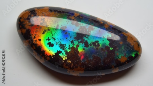 A polished apache tears stone with a vibrant, iridescent display of colors including green, blue, and red.