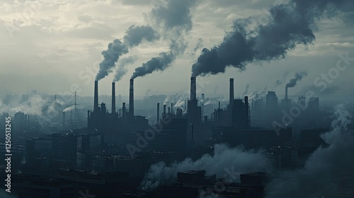 A polluted cityscape with smoke-filled air rising from towering industrial chimneys, emphasizing climate concerns.