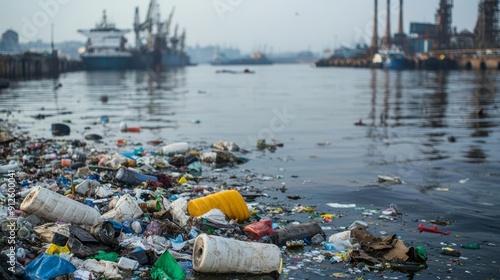 A polluted industrial harbor with oil slicks and trash floating in the water
